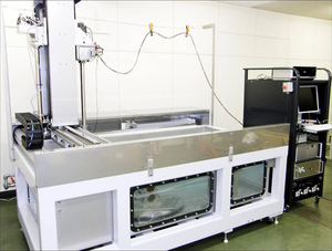 - ・微細な内部キズの検出を目的としたスキャナー付超音波探傷装置で、試料を水中に保持して探傷する。探傷結果はエコー高さ又は深さに関して色分けし、平面的投影図として表示される。各種曲面を有する被探傷材にも対応可能である。