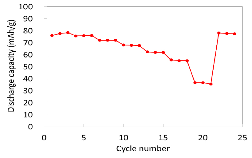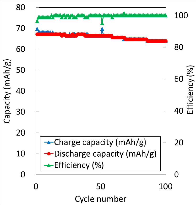 - サイクル特性)1Cレートのcc充電-cc放電で良好なサイクル特性を示す。
