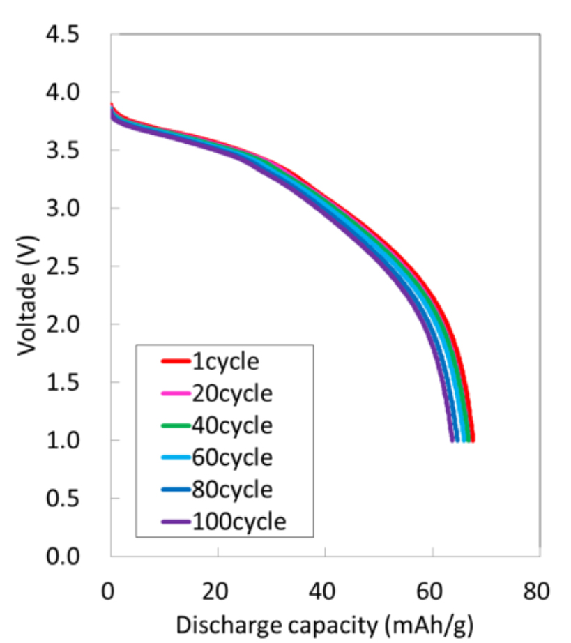 - 活物質の合成が可能出力特性)50Cにおいても放電率47%と良好な入出力特性を示す。