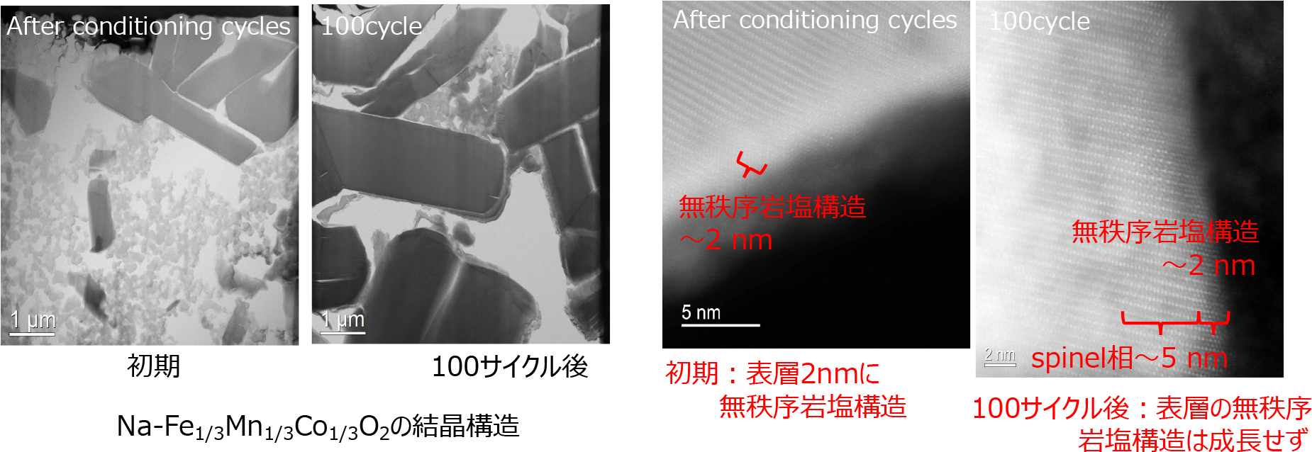 - 100サイクル後についても表層の無秩序岩塩構造の成長は確認されなかった。