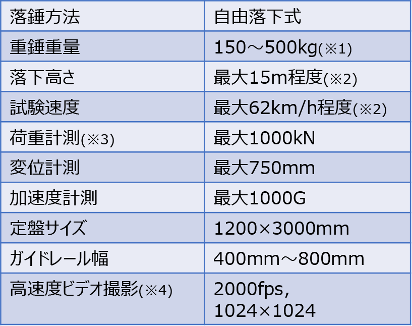 - バリア衝突試験(技術内容C)では実車レベルでの試験が可能であり、落錘衝撃試験装置で試験が対応できない試験体や最大100kJまでの衝撃試験が可能となりました。