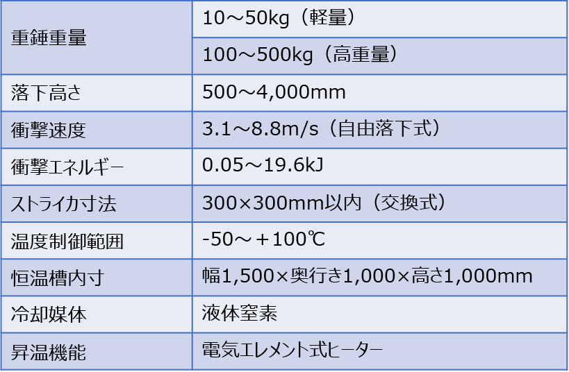- 大型恒温槽を備えており、恒温槽付き落錘衝撃試験機としては世界最大クラス。