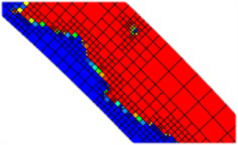 飛沫を解像するため、動的にメッシュを精細化より小さな飛沫に対してはラグランジュを用いた手法も併用する