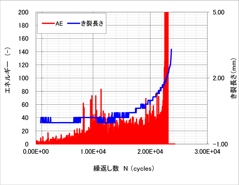 図2にAEエネルギー、き裂長さと繰返し数の関係を示します。AEエネルギーは、き裂発生の直前に上昇が見られます。また、き裂進展とAEエネルギーの挙動には相関がみられました。
