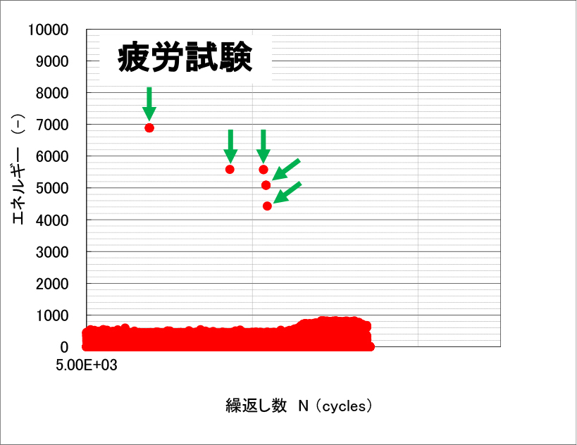 疲労試験時のき裂が発生したノッチ部の先端は小規模降伏状態とみられ、ここでは累積する微小的塑性変形がひずみ解放の臨界点に達したことで、ノッチ先端の開口時に放出された急激なAEエネルギーを捉えたものと判断します。