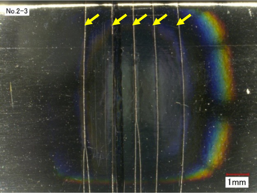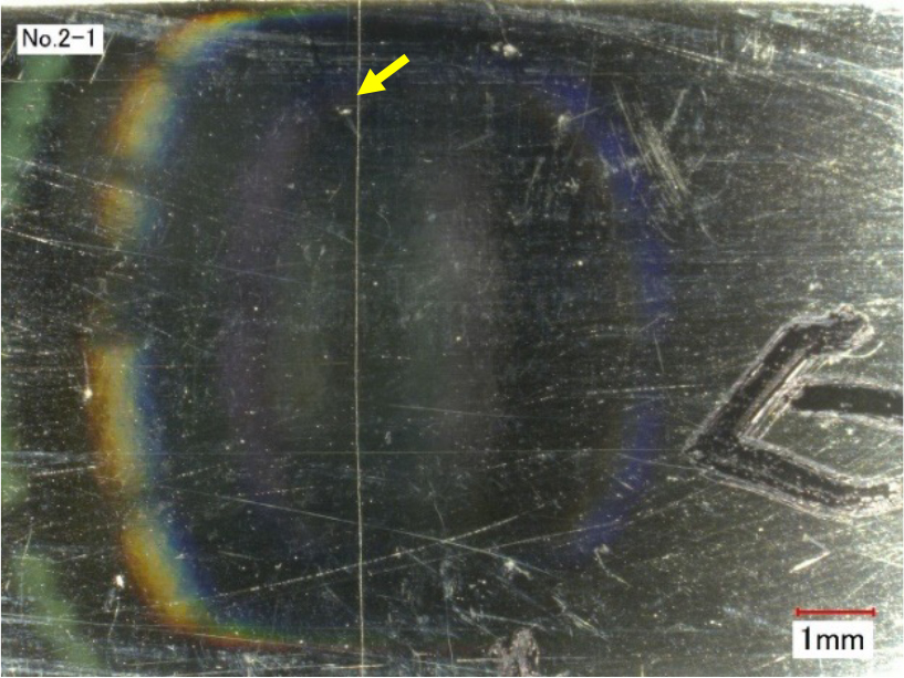 めっきの主成分であるニッケルは、基材に比べて硬さは2倍以上ヤング率は2倍弱であり、めっき厚が基材の厚さ(5mm)に対して10~20μmと薄いため、き裂が一気に貫通したことで、瞬間的に高いAEエネルギーが発生したと考えられます。