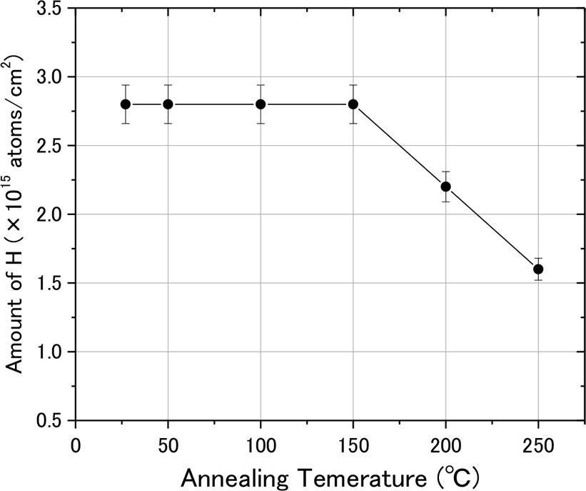 フッ酸処理を行ったSi(100) ウエハを室温環境下と200℃で試料を加熱しながら測定したHR-ERDAスペクトルを比較すると、200℃で加熱しながら測定したスペクトルの強度が室温環境下で測定したときより減少している。試料の加熱温度を変化させたときのH量を調べた結果、加熱温度が150℃までは表面のH量に変化がみられないが、200℃に温度を上昇させると表面H量が減少する傾向が認められる。この傾向は先行研究1)の報告とも一致していることから、本手法によって表面に吸着した有機汚染物や吸着水の影響が抑制されていることがわかる。
