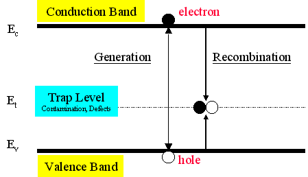 レーザの照射により価電子帯(Valence Band)と伝導帯(Conduction Band)に発生した電子と正孔は、シリコンウェーハの物理的特性で決まるライフタイムの後再結合して消滅します。汚染や欠陥により不純物準位(Trap Level)の密度が高いと、再結合の確率が増加するので、ライフタイムは短くなります。