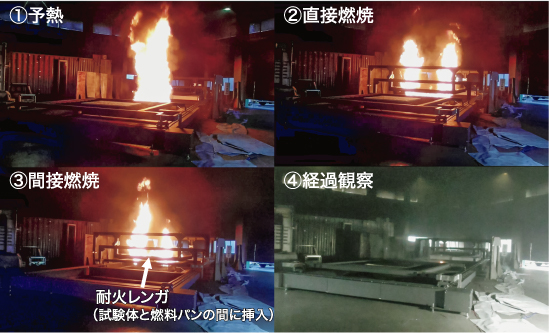 《試験の流れ》 着火→予熱60秒→直接燃焼70秒→間接燃焼60秒(試験体と燃料パンの間に耐火レンガを挿入)→経過観察