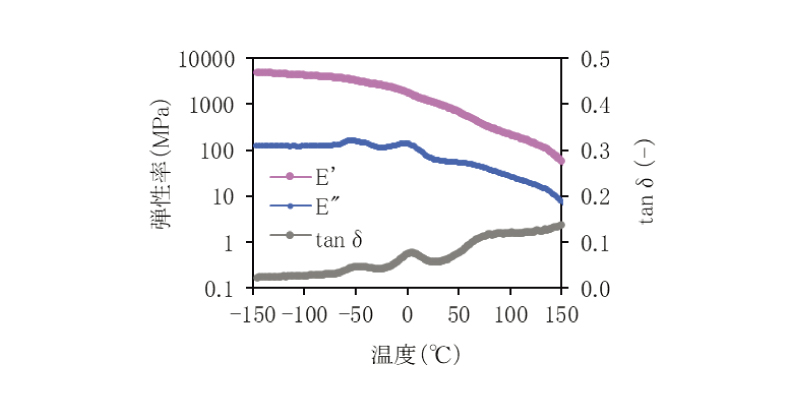 次に、供試材に含まれる成分を、動的粘弾性試験による損失正接(tanδ)の温度依存性から考察した。動的粘弾性試験による損失正接は、微小な正弦波ひずみを与えた際の応力の応答の位相差から求められる。この試験方法では、ガラス状態からゴム状態へ転移する際tanδにはシャープなピークが、結晶構造の緩和が生じる際には緩やかなピークが見られる。