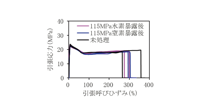 ダンベル形状の試料を、115MPaの高圧水素ガスを充填した容器内へ入れ、80℃×100時間の暴露処理を行い、取出して1週間以上経過後、室温で引張試験を行った。比較として、115MPaの高圧窒素ガスへも暴露し、同様に引張試験を行った。