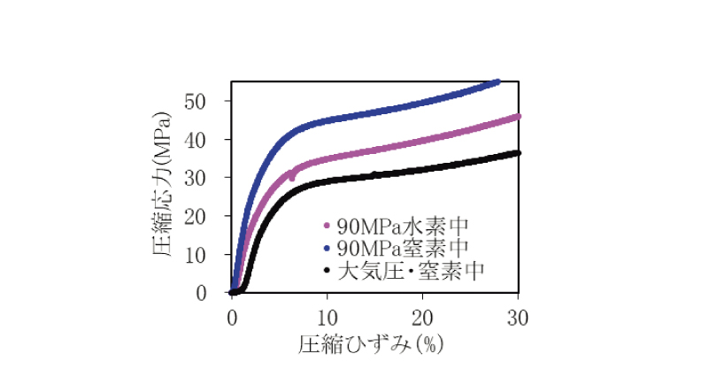 また、水素ガス中では、引張試験および圧縮試験、いずれの場合も、窒素ガス中より降伏応力が下がった。これは、水素ガスが分子鎖間に侵入することで可塑性を与えたためと考えられる。