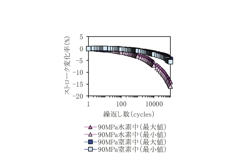 なお、高圧環境下での圧縮疲労試験において、水素ガス中および窒素ガス中で同じ荷重を繰返し負荷したところ、水素ガス中では窒素ガス中より変形量が大きかった。このことも、繰返し圧縮時に結晶性の変化はなく、水素ガスの侵入による可塑性の影響が続いたためと考えられる。