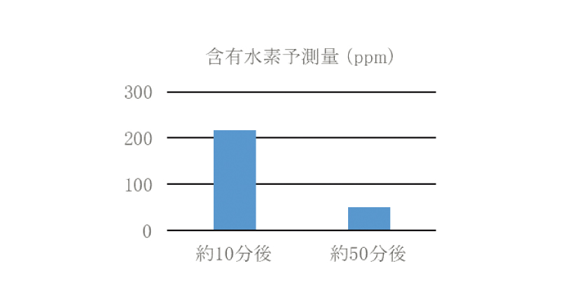 次に、高圧水素ガス暴露から取出した試料に、どれだけの水素ガスが入っているかを調べた。前述と同様に20MPa水素中で暴露し、急減圧開始から約10分後と約50分後に液体窒素中へ入れて水素ガスが抜けないように運搬し、水素分析装置のところで解凍し、室温で水素ガス放出量を測定した。室温で水素ガスの放出が終了したところで、放出量と経過時間との関係線図から外挿し、急減圧開始から約10分後と約50分後の含有水素予測量を算出した。