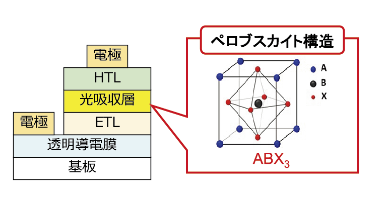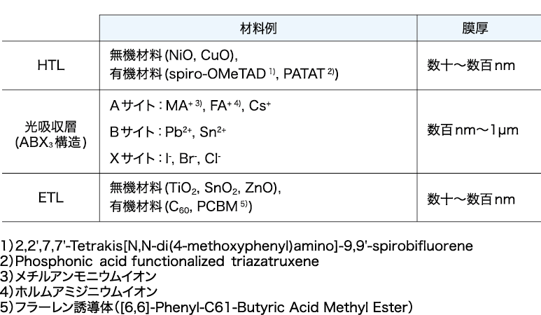 第1図にペロブスカイト太陽電池(以下PSCsとする)の基本的なデバイス構造を示す。PSCsはペロブスカイト層を正孔輸送層(HTL)および電子輸送層(ETL)で挟み込んだ積層構造を有しており、ペロブスカイト層はABX3型の結晶構造を取る。第1表に、各層にもちいられる材料例および膜厚を示す。ペロブスカイト層・HTL・ETLの膜厚はそれぞれ1µm以下であり、また製造工程の温度もSi太陽電池が最大約1000℃に対し、PSCsは約150℃である。そのため、基板材料の候補としてガラスだけでなく、PETなどの樹脂材をもちいることができ、軽量・フレキシブルなデバイス設計が可能である。各薄膜の成膜手法についても、ラボサイズであればスピンコート法やスパッタ法、大面積の場合はスプレー法やダイコート法などが採用されているため、製造コストの低減が見込まれる。