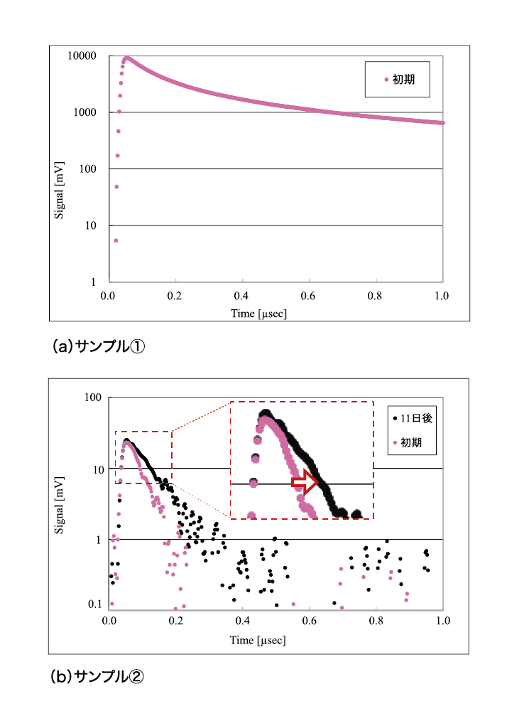 次に、サンプル②から得られた減衰カーブを第9図(b)に示す。サンプル②は透明導電膜であるITO層を有するため、ITO層が無いサンプル①に比べて信号強度の低下が認められたが、減衰挙動の検出には支障のないレベルであった。さらに、サンプル②において、劣化によるライフタイムへの影響を調べるために、室内雰囲気曝露前後の測定で得られた減衰カーブを比較した。その結果、時間と共にライフタイムが長くなる傾向が認められた。詳細な要因解明は今後進めることとするが、ITO層とペロブスカイト層の界面剥離によるキャリアの消滅速度の低下が一因と予想される。