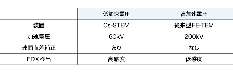 以上を踏まえ、Cs-STEM(球面収差補正付走査透過電子顕微鏡)での低加速電圧観察により、ペロブスカイト層に対して、結晶構造や組成を維持したまま評価できるか検討した。