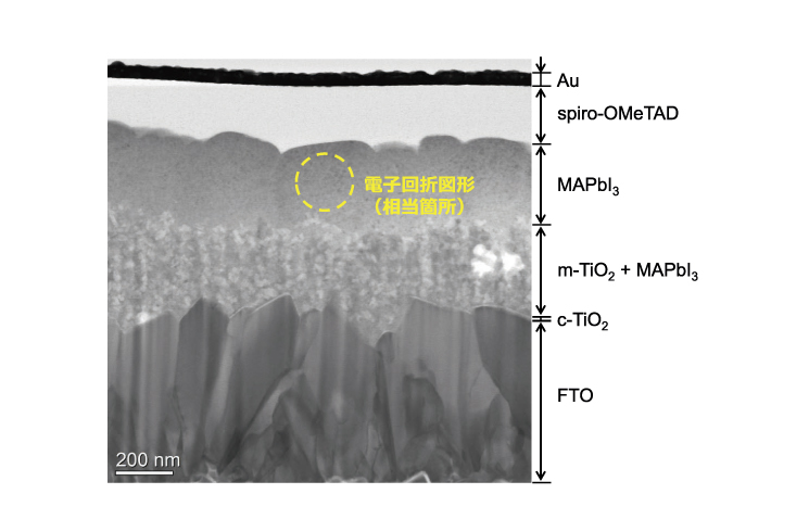 第2図に、高加速電圧条件の断面TEM観察結果を示す。透明導電膜の上に緻密TiO2層、多孔質TiO2層が積層され、ペロブスカイト層にはメチルアンモニウムヨウ化鉛(MAPbI3)がもちいられている。ペロブスカイト層は膜厚方向には1つの結晶粒で形成されており、それぞれの結晶粒が200~300nmであることが分かる。興味深いのは、結晶粒の中にモザイク状のコントラストが確認された点である。第3図にペロブスカイト層の1つの結晶粒に対象を絞った制限視野電子回折図形を示す。結晶粒内は単結晶を示す回折図形が得られているが、前述のモザイク状のコントラストは、わずかに方位の異なる結晶が存在している可能性が示唆される。今後、結晶構造をより詳細に解析することで、さらに材料開発に役立てられるものと考えられる。