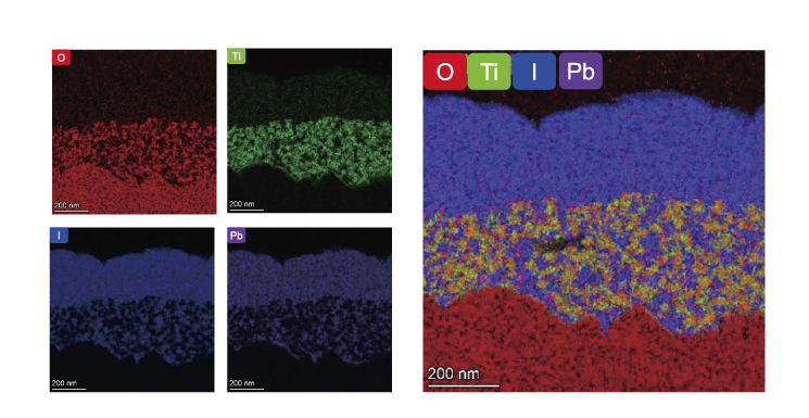 第2図のような低倍率の観察のみでは高加速電圧をもちいても顕著な変質は認められなかった。電子線の照射密度が抑えられ、熱的ダメージやノックオンダメージが抑えられたためと考えられる。しかし、長時間の電子線照射を必要とするEDXマッピング分析や原子分解能観察のような高倍率観察では、ペロブスカイト層の変質が認められた。電子線による変質を低減するため、加速電圧を60kVに下げてCs-STEMにてPSCsを評価した事例を紹介する。
